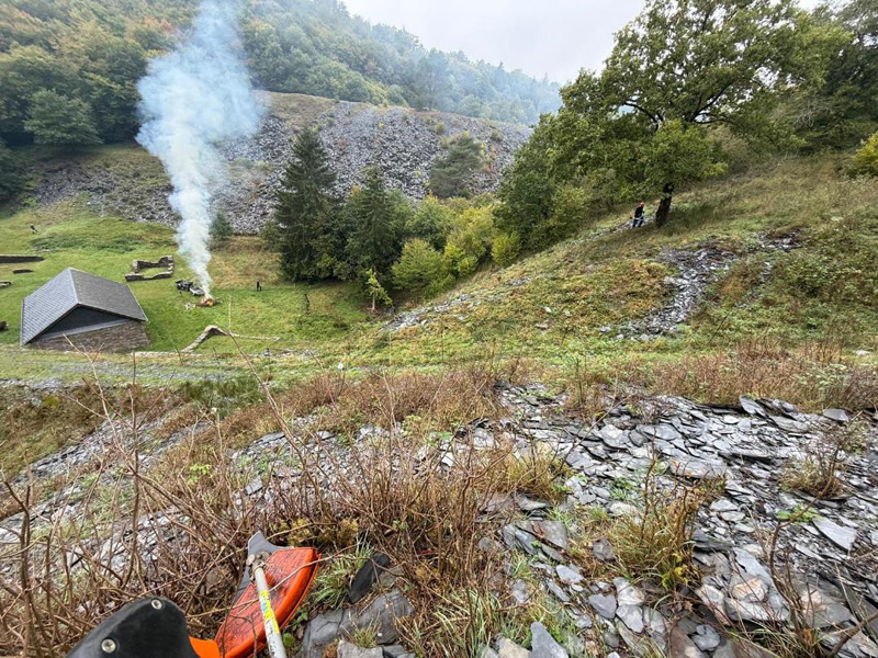 Am Samstag, den 27. September 2025 führt der Verein zur Erhaltung der Schieferbergbaugeschichte (Vorsitzender Andreas Klotz) seine jährliche Pflege- und Freischneidemaßnahme im Kaulenbachtal durch. Beim Start der Maßnahme, um 09.00 Uhr auf dem Gelände der Herrenwiese im Kaulenbachtal, kann Projektleiter Frank Hillen (Laubach) gemeinsam mit dem Vereinsvorsitzenden die Helfer begrüßen. Besonders der Pfadfinderstamm Müllenbach-Laubach (Vorsitzender Tobias Schneider, Laubach) ist mit etwa 25 Helfern, wie immer, sehr stark vertreten. Auch die FFw Laubach (Wehrführer Michael Zirwes) kann als Patenschaftsträger neben einigen Vereinsmitgliedern des Schiefervereins begrüßt werden. Die Pfadfinder pflegen wie schon in den vergangenen Jahren ihren Patenschaftsbereich „Kaulenwiese“. Die FFw Laubach setzt erstmalig und erfolgreich einen Traktor mit Seilwinde ein, um die Verbuschung auf der Halde „Escherkaul“ zu bekämpfen. Stockausschläge mit sehr umfangreichem Wurzelwerk können von der Halde entfernt werden und verhindern so ein jährliches zurückschneiden der Ausschläge.