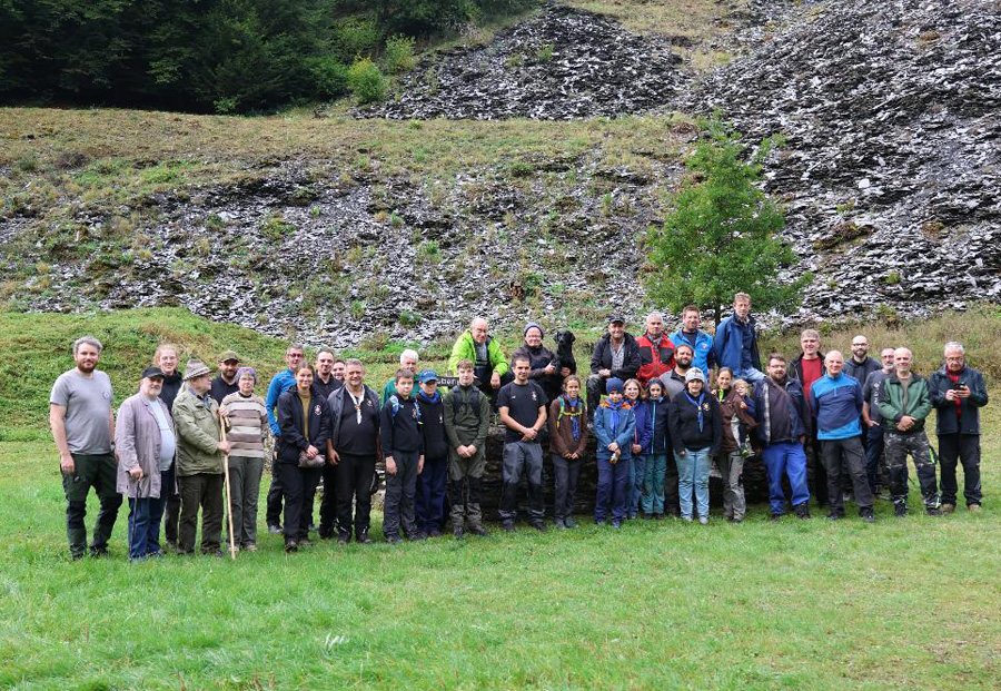 Nach Beendigung der erfolgreichen Pflegearbeit gibt es für die Helfer ein deftiges Mittagessen des „Imbiss zum Kaulenbachtal“ (Carmen u. Jürgen Köhn). Beim Abschlussfoto bedankt sich der stellvertretende Vorsitzende Rolf Stoll bei den 40 freiwilligen Helfern für ihren wichtigen Einsatz. Ein besonderer Dank geht an den Pfadfinderstamm Müllenbach-Laubach, der unter vorbildlichem Personaleinsatz alljährlich einen wichtigen Partner bei den Freischneidemaßnahmen darstellt. Ebenfalls der FFw Laubach, die in diesem Jahr innovative neue Maßnahmen zur Bekämpfung der Verbuschung der Halden eingesetzt hat, gilt hierfür ein herzliches Dankeschön. Auch den Vereinsmitgliedern des Schiefervereins und deren Freunden und Bekannten, die sich teilweise schon seit dem Jahre 1995 für die Pflege des Kaulenbachtals einsetzen gilt der Dank des stellvertretenden Vorsitzenden. Biotopbetreuerin Dr. Corinna Lehr (biodata Mainz) und biodata Geschäftsführer Winfried Schepp, die ebenfalls jährlich die Maßnahme begleiten, schließen sich dem Dank des Vorredners an und sind wie jedes Jahr vom Einsatzwillen der vielen freiwilligen Helfer für den Naturschutz begeistert. Begleitet werden die Fachleute der biodata Mainz von Stefan Heyne, Geschäftsführer der Firma „Grün-Plan-Eifel“ die geplant in den Folgejahren die Aufgaben der scheidenden biodata übernehmen wird. Auch er zeigt sich überwältigt von dem Einsatzwillen der vielen Helfer. Der obligatorische Besuch des mittlerweile 90-jährigen Vereinsmitglieds und ehemaligen Wanderführers Karl-Heinz Abramowicz, der seit Beginn der Pflegemaßnahmen noch keine einzige verpasst hat, zeigt die hohe Identifikation welche die Vereinsmitglieder mit dem Kaulenbachtal haben. Karl- Heinz würde auch heute noch mit auf die Halden steigen, wenn nicht gesundheitliche Einschränkungen ihn daran hindern würden. Im Oktober wird dann zum Abschluss des Pflegejahres im Kaulenbachtal die FFw Leienkaul eine Freischneideaktion in ihrem Patenschaftsbereich „Halde Mariaschacht“ durchführen. Die durchschnittlich 10 – 15 Helfer greifen hierbei auf den Maschinenpark des Schiefervereins zurück, was die zeitliche Verschiebung der Maßnahme sinnhaft erscheinen lässt. (Dieter Laux, stellvertr. Schriftführer)