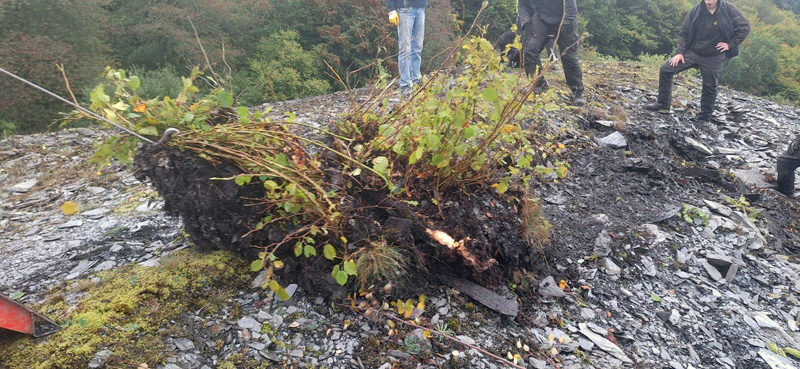Die FFw Laubach setzte der Verbuschung der Schieferhalden in ihrem Patenschaftsbereich in diesem Jahr mit einem Traktor ausgestattet mit Stützschild und Seilwinde zu. Hierbei kam zum Vorschein, was lange vermutet wurde. Durch das jährliche Zurückschneiden der Stockausschläge an der Oberfläche, hat sich der Wurzelstrang extrem verstärkt (siehe Foto 2). So stellt das Projekt "Seilwinde" wohl den zukünftigen Lösungsansatz zur Verhinderung der Verbuschung der Schieferhalden dar.